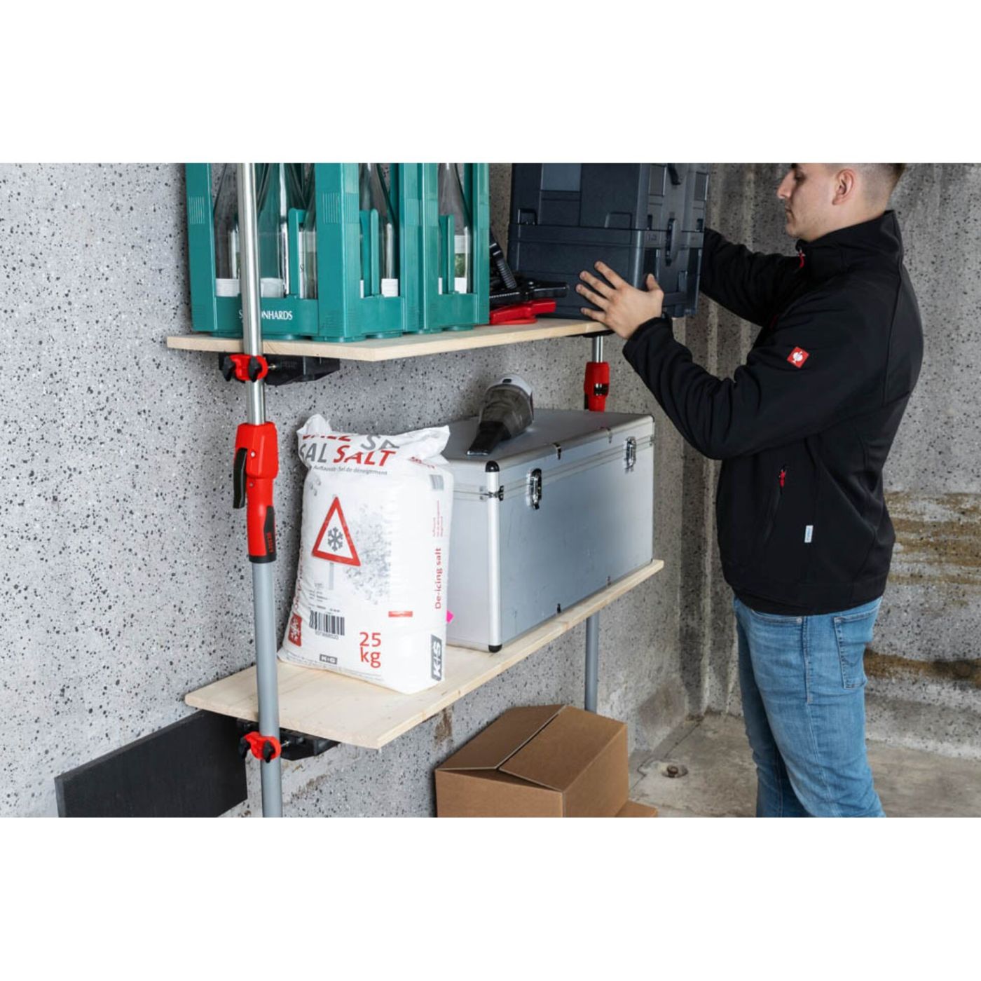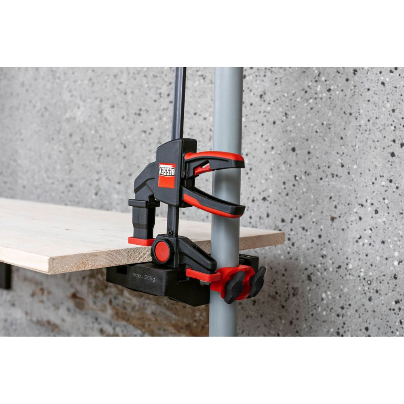 The BESSEY multifunction bracket STE‑MH‑SET is an accessory for ceiling and mounting supports that allows you to securely fix partitions, storage areas or devices such as lasers and cameras. It is mounted tool-free, supports up to 50 kg per holder and is made of reinforced plastic with a non-slip support surface.