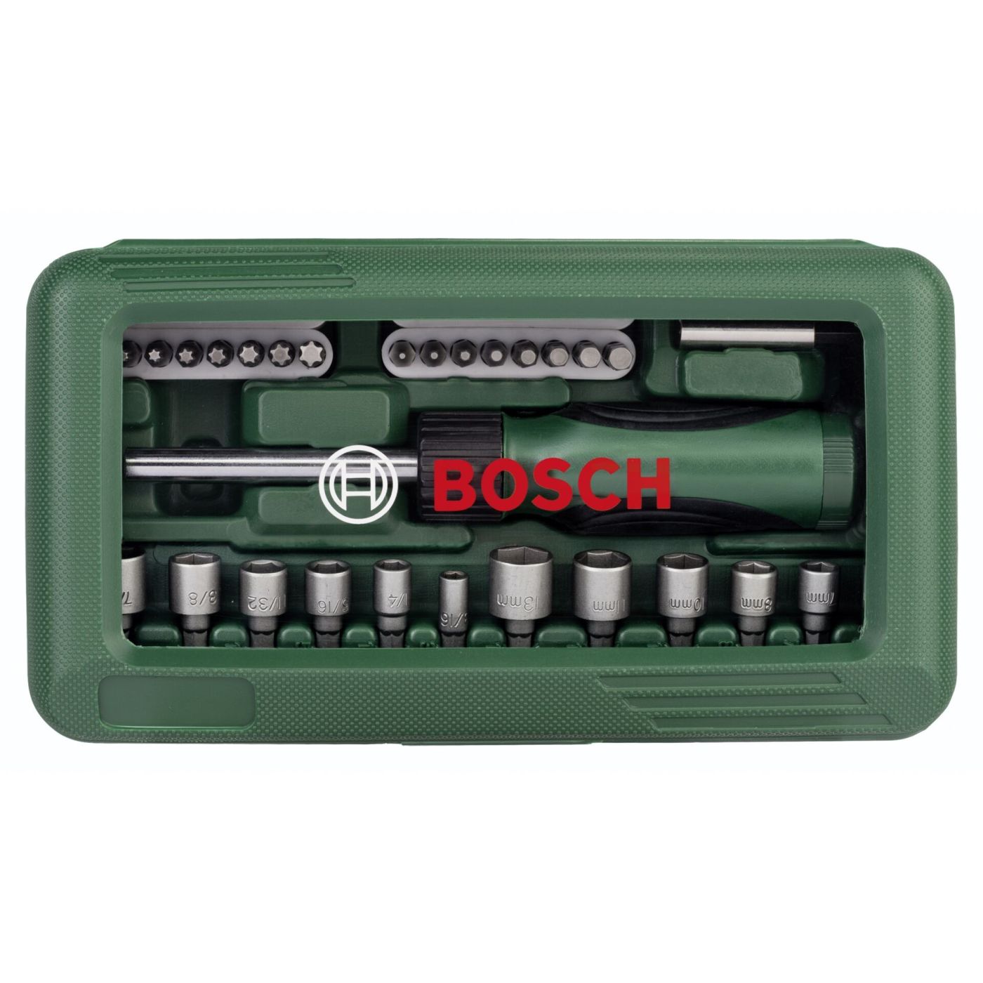 32 bita za odvijač L = 30 mm, PH 0/1/2/3, PZ 0/1/2/3, S 3/4/4,5/5/6/7/8/9, HEX 1,5/2/2,5/3/4/5/5,5/6, T 8/10/15/20/25/27/30/40, 12 nasadnih ključeva za šesterokutni vijci, 3/16", 1/4", 5/16", 11/32", 3/8", 7/16", 6, 7, 8, 10, 11, 13 mm, 1 univerzalni držač, magnetski, 1 ručni odvijač, funkcija čegrtaljke, okretanje u smjeru/lijevo od kazaljke na satu, spremnik za bitove u dršci