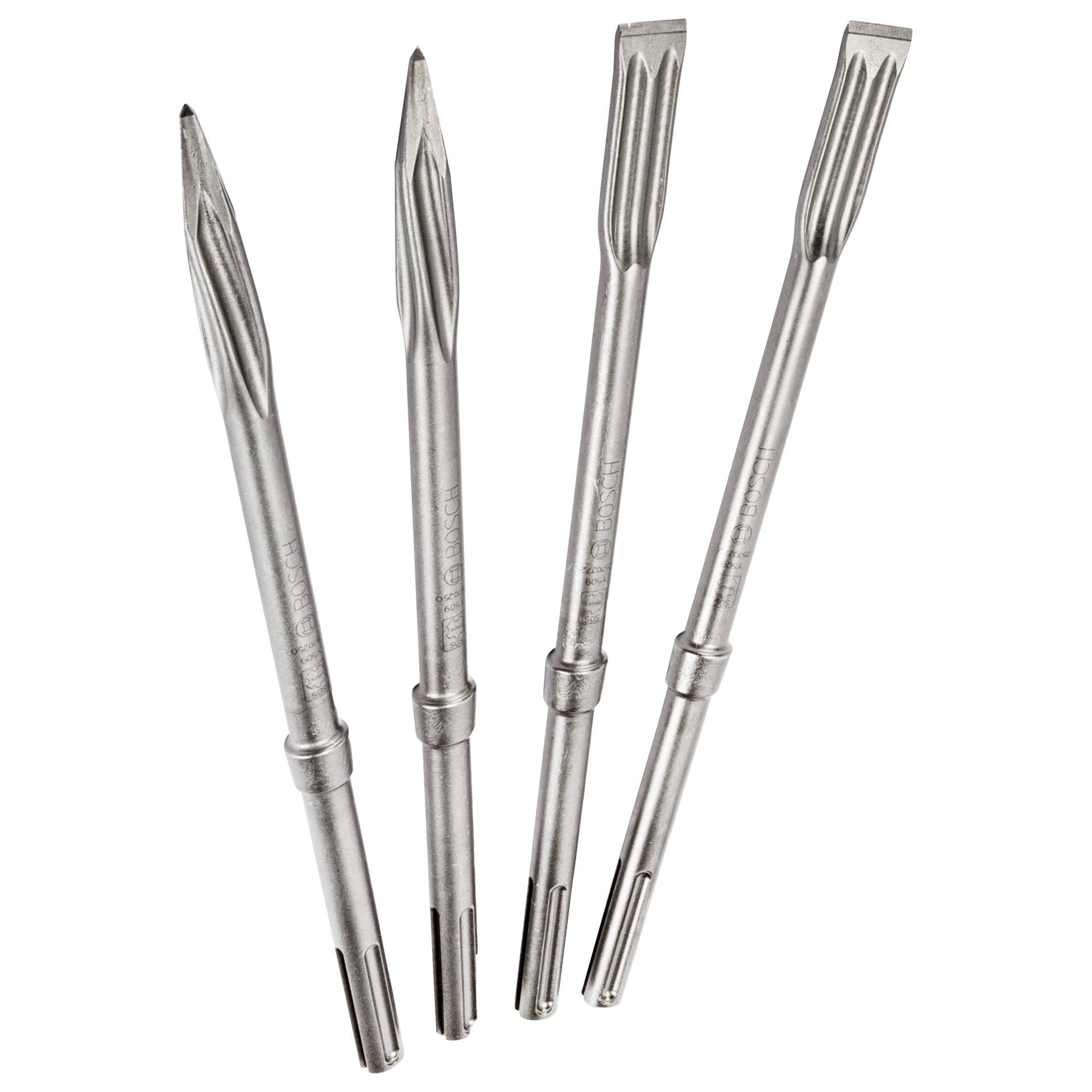 The 4-piece chisel set with SDS max RTec contains RTec chisels, which are perfectly suited for various concrete work. They jam less and advance faster. The chisels are designed for chiselling, demolition and adjustment work in concrete and masonry, as well as for opening joints and exposing reinforcements.