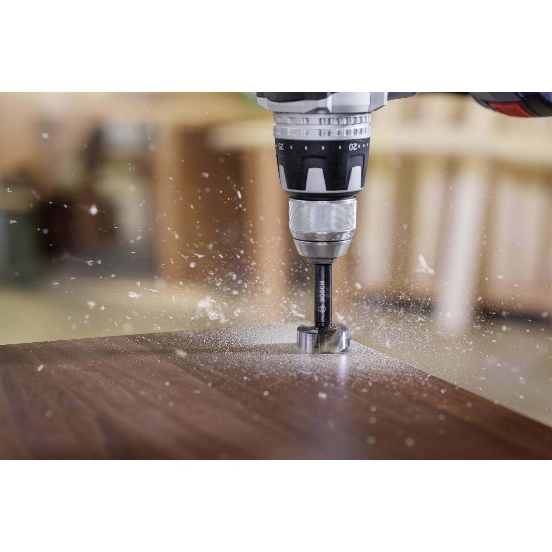 The tooth-shaped design provides less friction and heat, resulting in greater durability. The short center point of the precision drill has two main cutting edges and one peripheral cutting edge (tooth-shaped) for accurate results. Allows smooth, splinter-free drilling of blind holes and drilling on edges and bevels, e.g. for fixing hinges, dowelling or removing knotholes. For drilling in soft or hard wood, veneer wood and non-laminated chipboard. It is suitable for all drills (drill screwdrivers, floor standing drills) with 10 mm chuck.