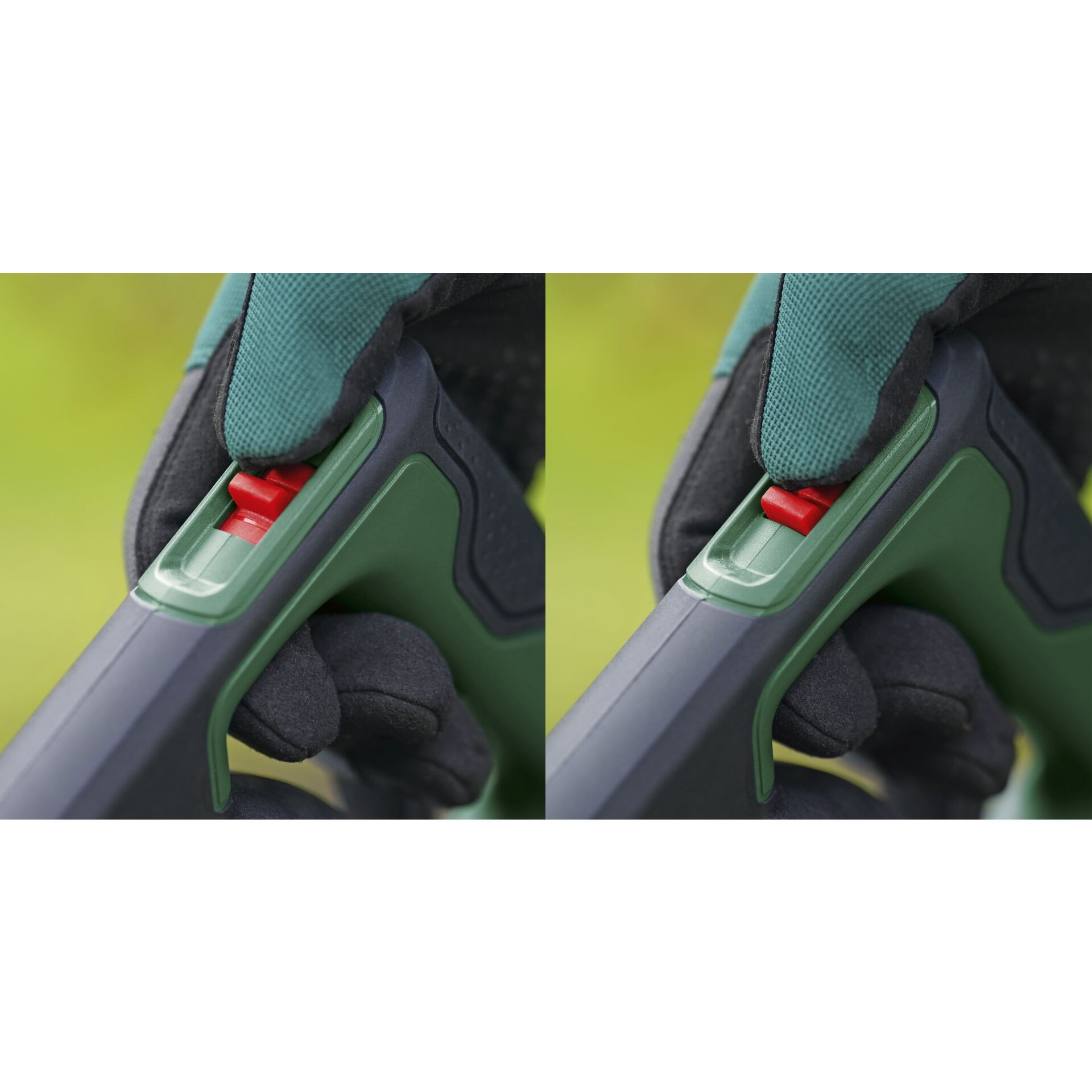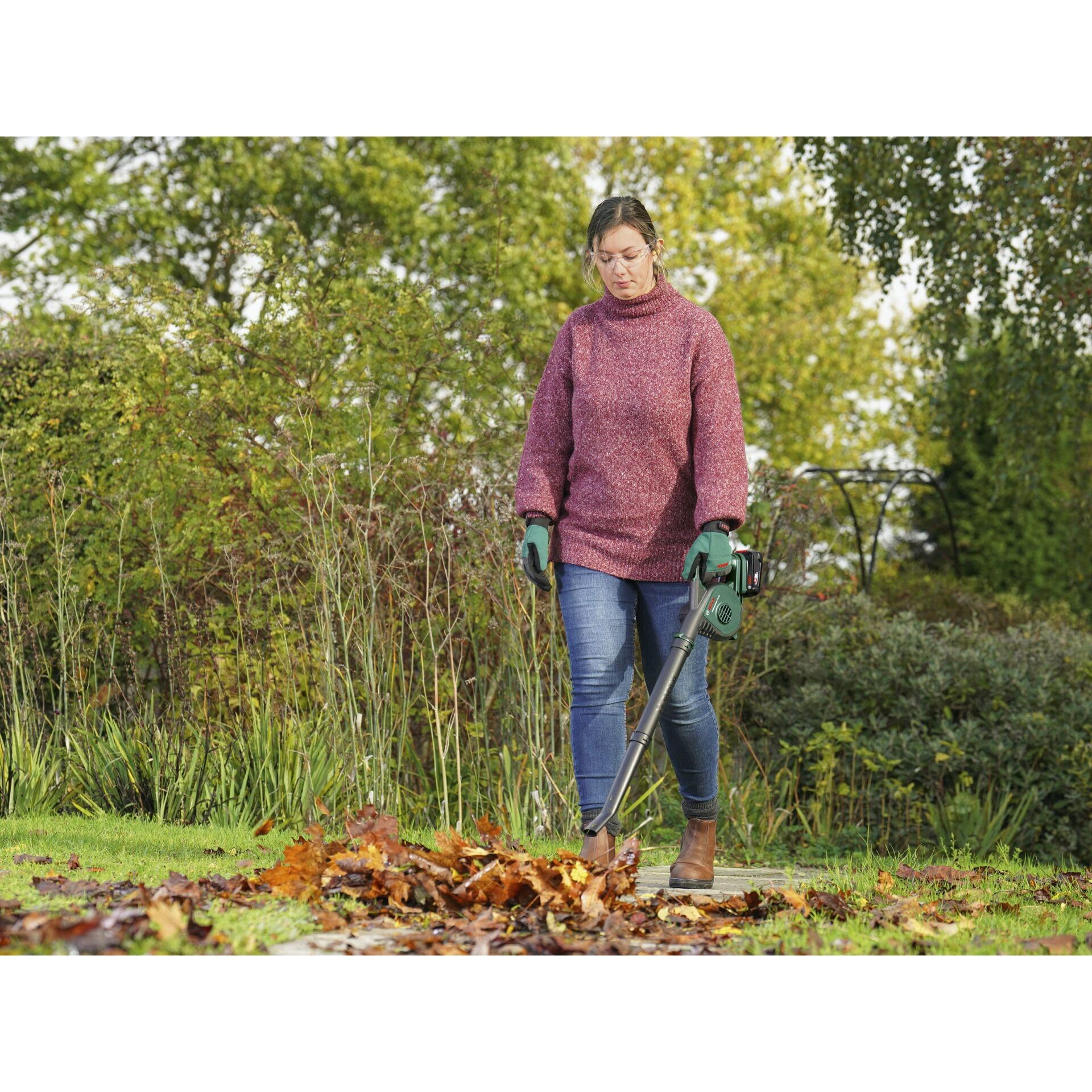 Easily remove garden waste with the UniversalLeafBlower 18V-130 wireless. The light and compact leaf blower has an ergonomic handle and can be easily carried to the far corners of the garden. It has a simple 2-speed switch for airflow control for more powerful or controlled cleaning. The Bosch 18V POWER FOR ALL battery and Syneon Technology provide an impressive air flow speed of 245 km/h for fast and powerful cleaning. Several nozzle attachments provide versatile flexibility when cleaning the garden. The leaf blower is easy to assemble and store compactly, and runs for up to 18 minutes on a single charge. The built-in Bosch Syneon Electronic protects the device and the battery and is part of the 18V POWER FOR ALL system. A single battery can be used for all 18V POWER FOR ALL tools.