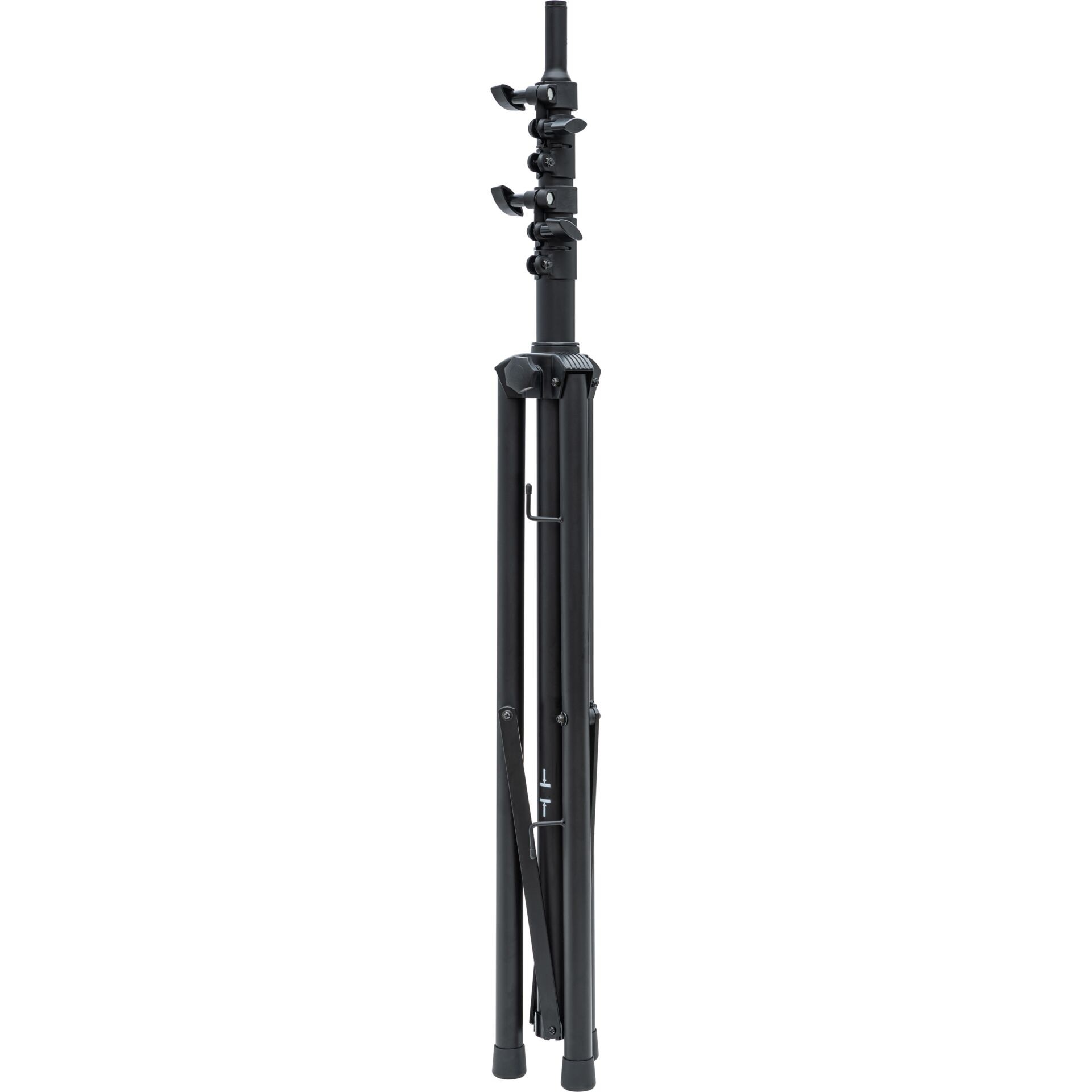 The Bau telescope tripod ST 302 with automatic lowering system allows a continuous height adjustment from 1.24 m to 3 m.In addition, the tripod offers flexible mounting options, including T-bar for mounting a single spotlight and a cross beam for mounting two spotlights. The automatic lowering system ensures a controlled lowering for additional safety. The telescope tripod with a maximum load of 20 kg and an integrated cable holder.