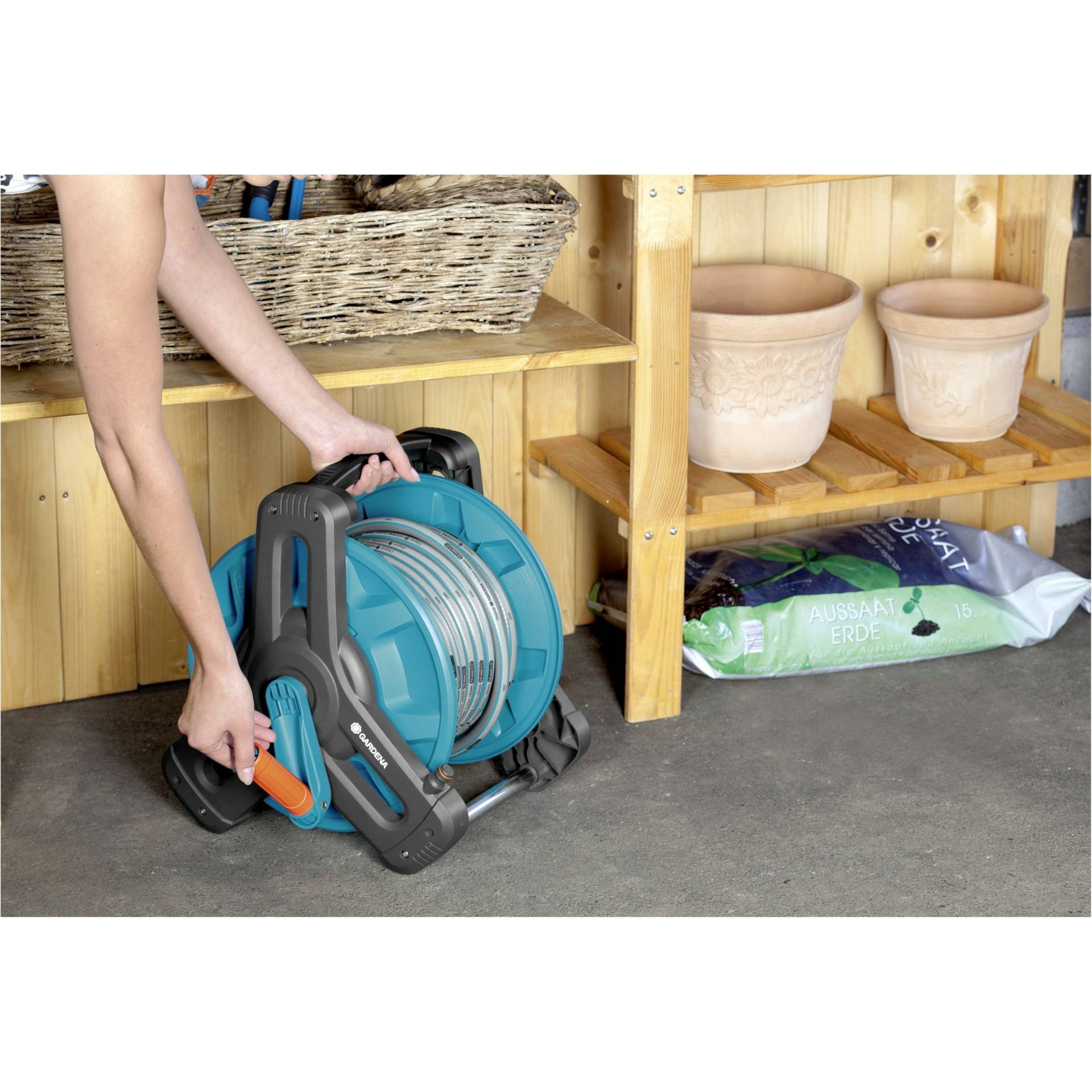 Thanks to the compact design and the foldable crank handle, the hose reel can be stored in a space-saving manner. This means that it can be stored in even the smallest of spaces.