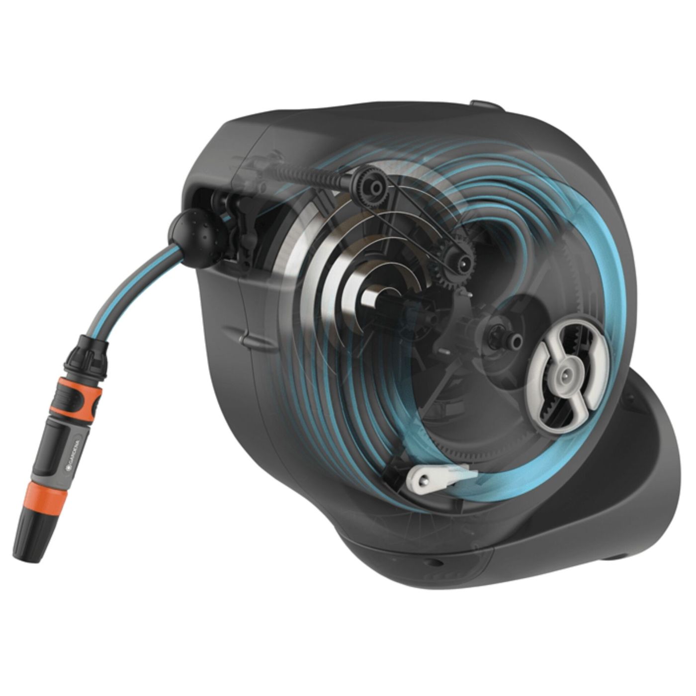 Laganim povlačenjem na kraju crijeva, integrirana čelična opruga se aktivira i automatski i pouzdano namotava crijevo, RollControl tehnologija osigurava sporo i sigurno uvlačenje, bez obzira koliko je crijevo odmotano,