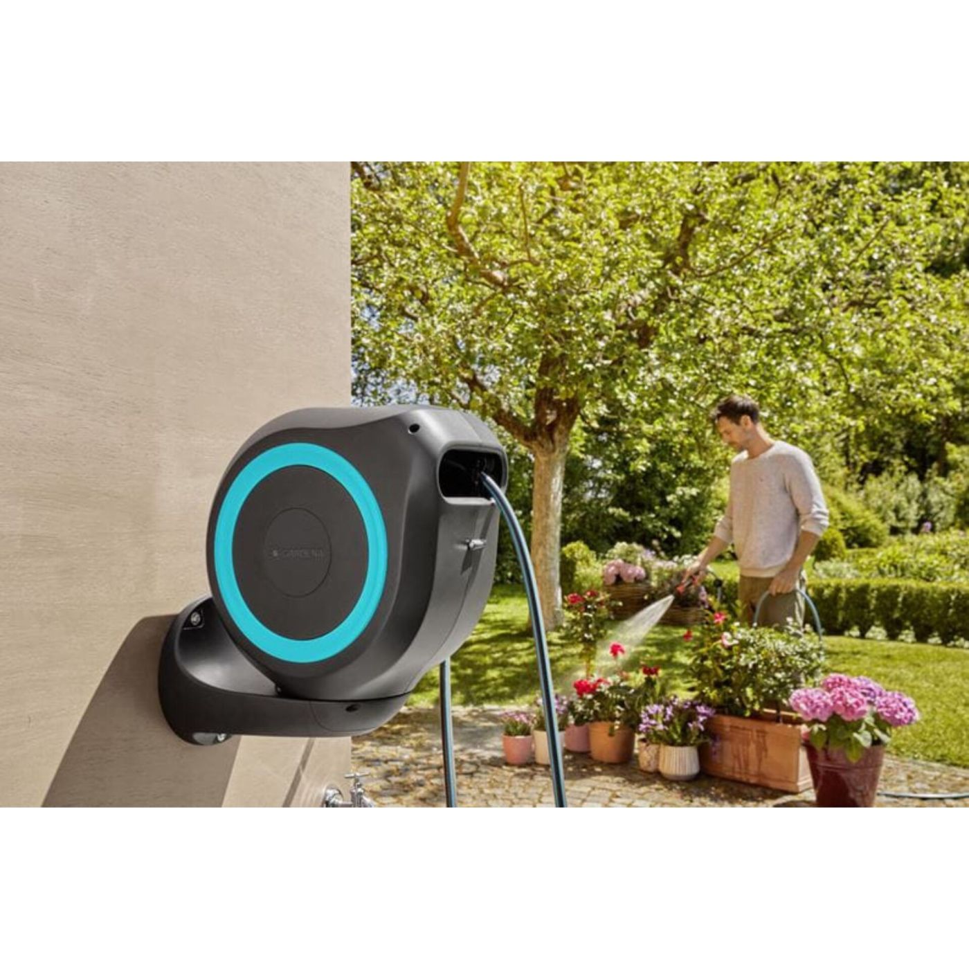 Zahvaljujući praktičnom zidnom nosaču, kutija za crijevo može se zakretati pod kutom većim od 180°. To vam omogućuje fleksibilno zalijevanje svakog kutka vašeg vrta bez savijanja crijeva.