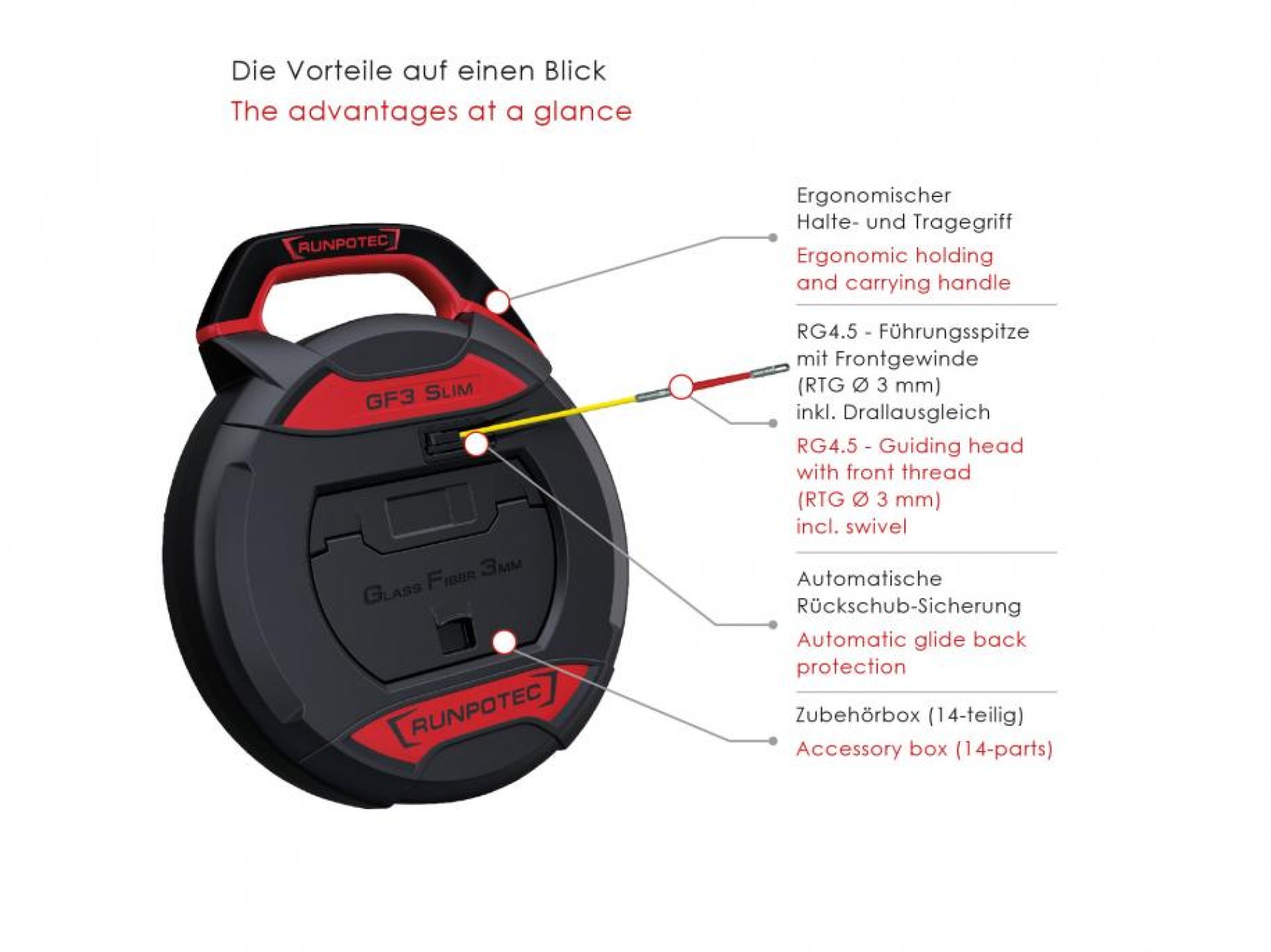 • Opseg isporuke: 1 x GF3 SLIM bez brojača metara u plastičnoj kutiji, duljina 50 m, 1 x RG4.5 - Vodilica s okretnim zglobom, sadržaj kutije s priborom: 1 x vučna ručka, 1 x specijalno ljepilo 3 g, 5 x završni spoj s navojem RTG Ø 3 mm, 2 x montažni ključ, 2 x vučna ušica Ø 4,5 mm, 1 x početna glava Ø 6 mm, 1 x početna glava Ø 4,5 mm, 1 x spojnica Ø 4,5 mm, 1 x adapter s navojem