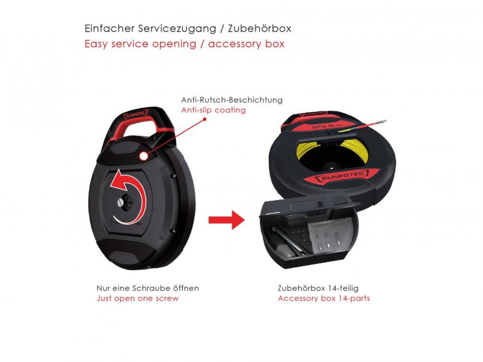 • Kutija se može otvoriti za servisne radove samo jednim vijkom na stražnjoj strani. To također omogućuje uklanjanje integrirane kutije za pribor, koja sadrži 14-dijelni set pribora. Priloženi adapter s unutarnjim navojem RTG Ø 3 mm na vanjski navoj RTG Ø 6 mm omogućuje mnoge moguće kombinacije.