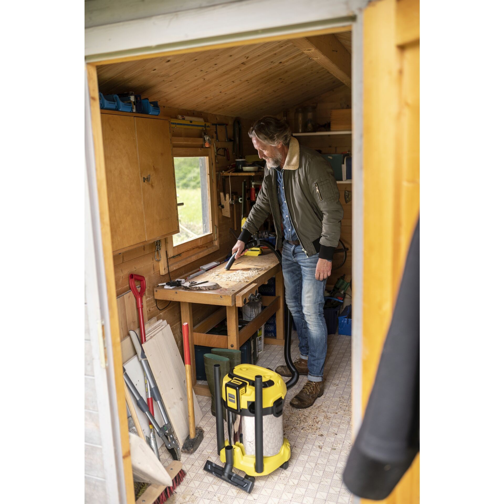 The device is also equipped with a robust and shock-resistant 17-litre stainless steel container, single-part cartridge filter as well as a fleece filter bag. The suction hose storage is space-saving; simply hang it securely on the device head.