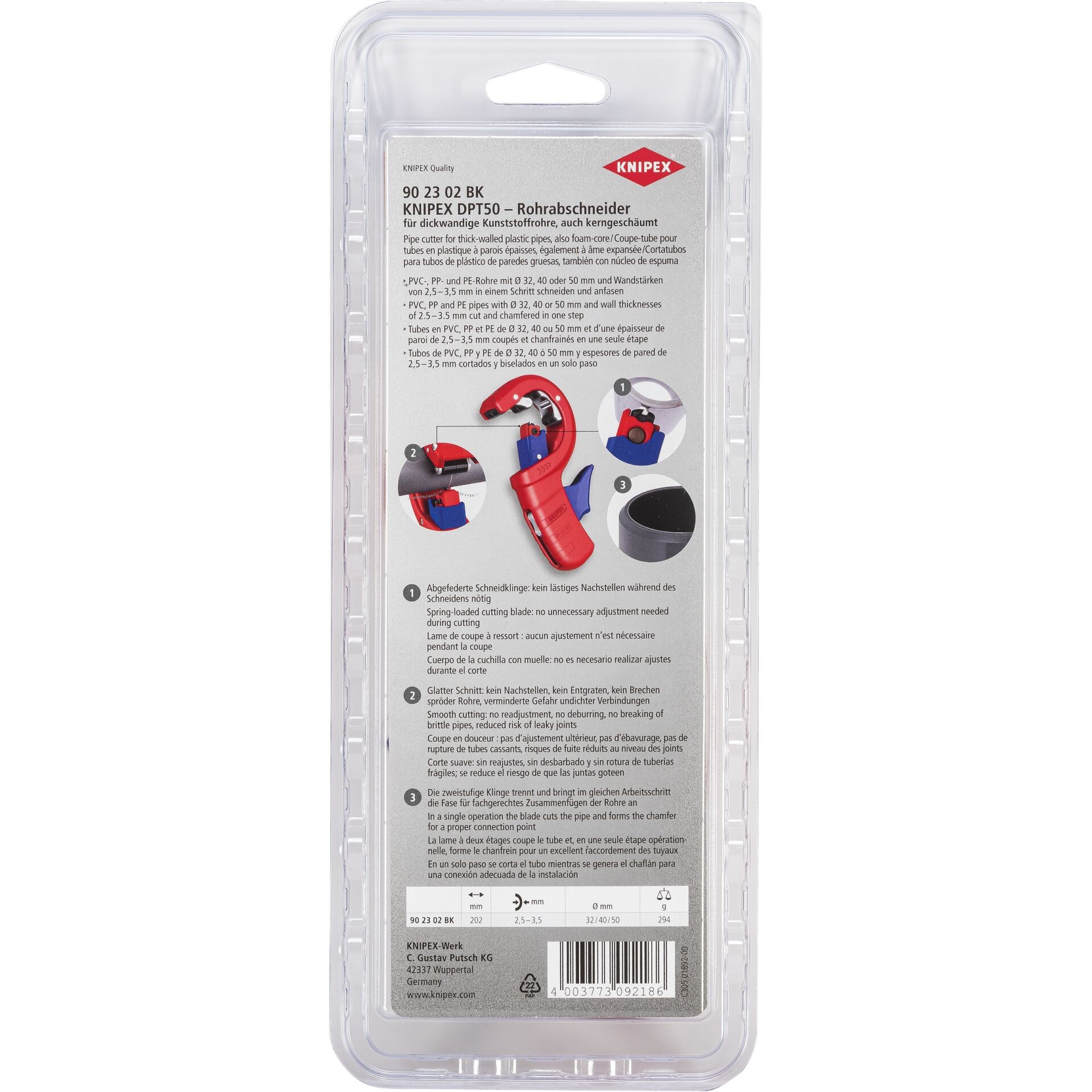 The KNIPEX pipe cutter DP50 is a precise tool for cutting and chamfering plastic drain pipes up to 50 mm in diameter. Thanks to sliding bearing rollers and self-adjusting guide, it allows effortless handling. The turning blade ensures a clean cut without reworking and can be changed without tools.