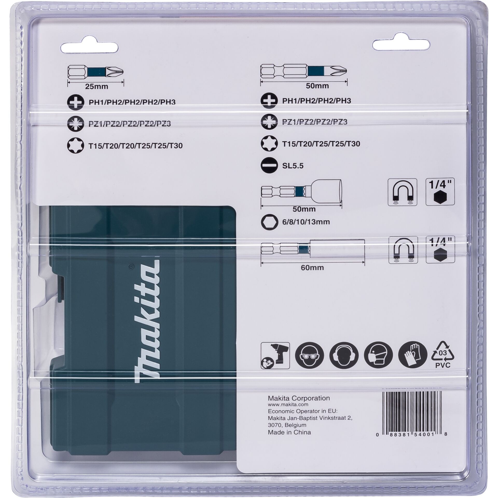 • Bits 50 mm: 1x PH1, 2x PH2, 1x PH3, 1x PZ1, 2x PZ2, 1x PZ3, 1x T15, 1x T20, 2x T25, 1x T30, 1x SL0.8x5.5
