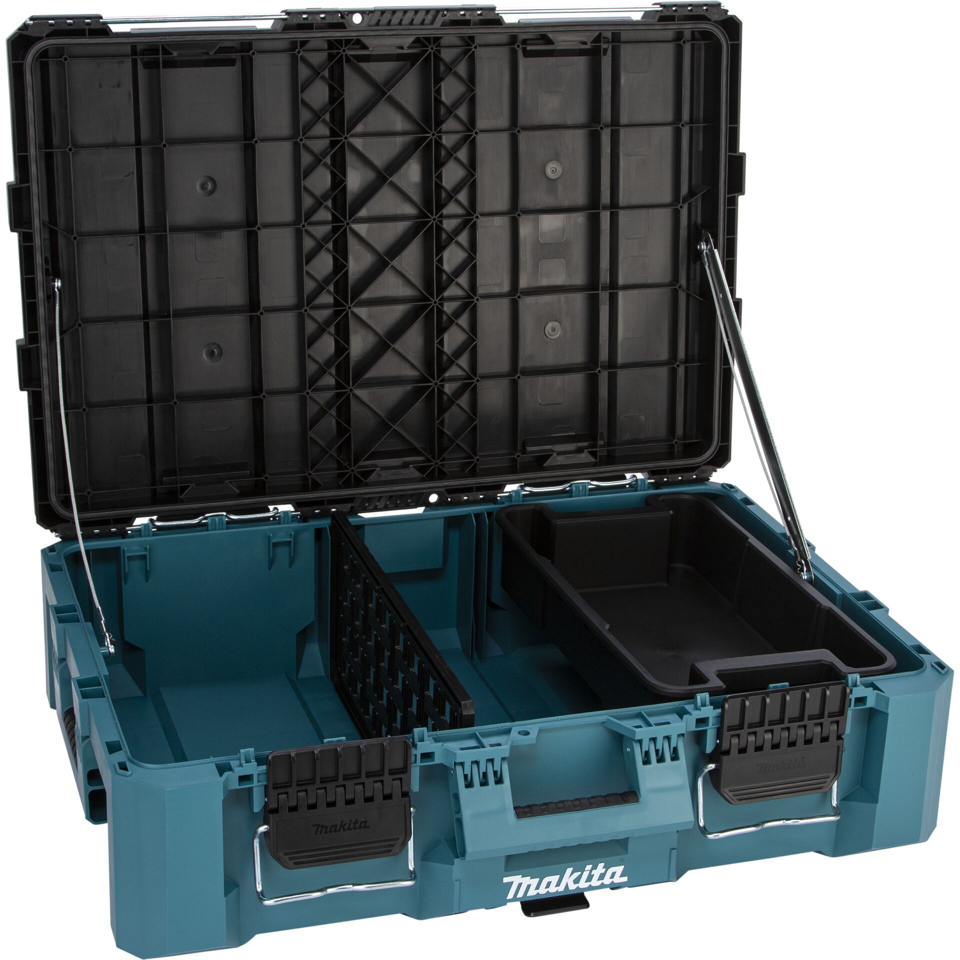 Makitina kutija za alat MAKTRAK L, volumena 63 litre i nosivosti 45 kg, nudi dovoljno prostora za alate, baterije i pribor, a zahvaljujući horizontalnom dizajnu, organizatoru i poklopcu koji se preklapa s obje strane, posebno je pristupačna i fleksibilna za korištenje, izrađena od kopolimerne plastike otporne na udarce u tipičnoj crnoj boji za Makitu s tirkiznim detaljima, idealna je za radionicu, gradilište i mobilnu upotrebu,