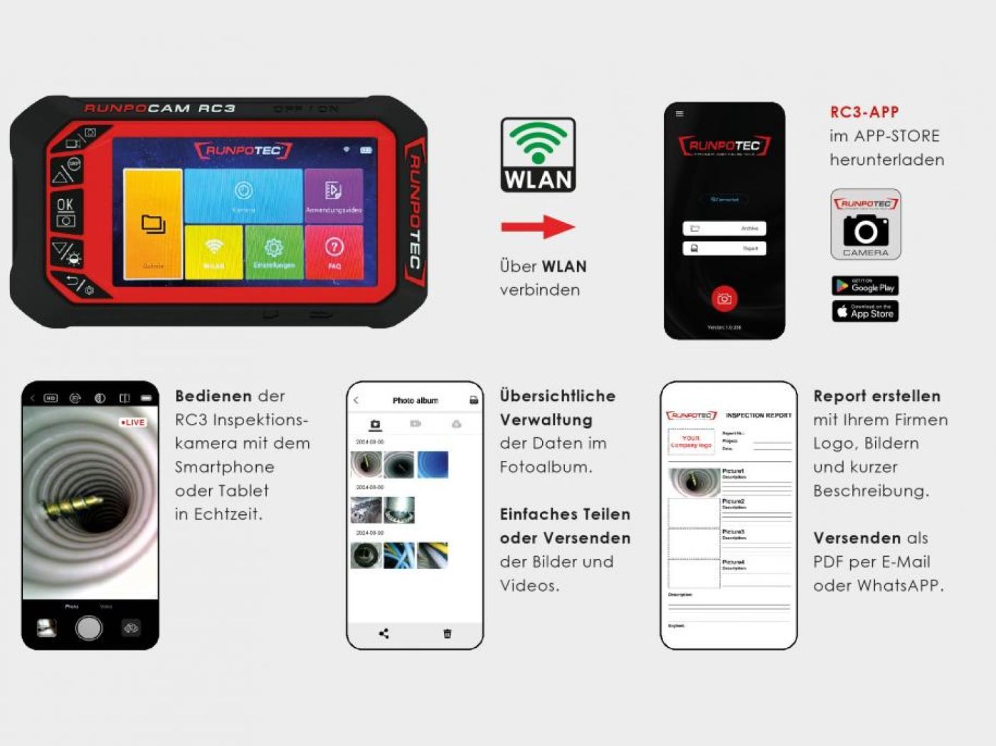 • RC3 inspekcijska kamera kombinira inovativnu tehnologiju sa pametnom povezivošću kako bi profesionalne inspekcije učinila jednostavnijima i preciznijima. Opremljena fleksibilnim dvostrukim kamerama, omogućuje snimanje slika i videozapisa u Full-HD kvaliteti. RC3 aplikacija podržava sigurnosno pohranjivanje dokaza, arhiviranje slika i sveobuhvatnu dokumentaciju snimaka te omogućuje jednostavno dijeljenje slika i videozapisa.
