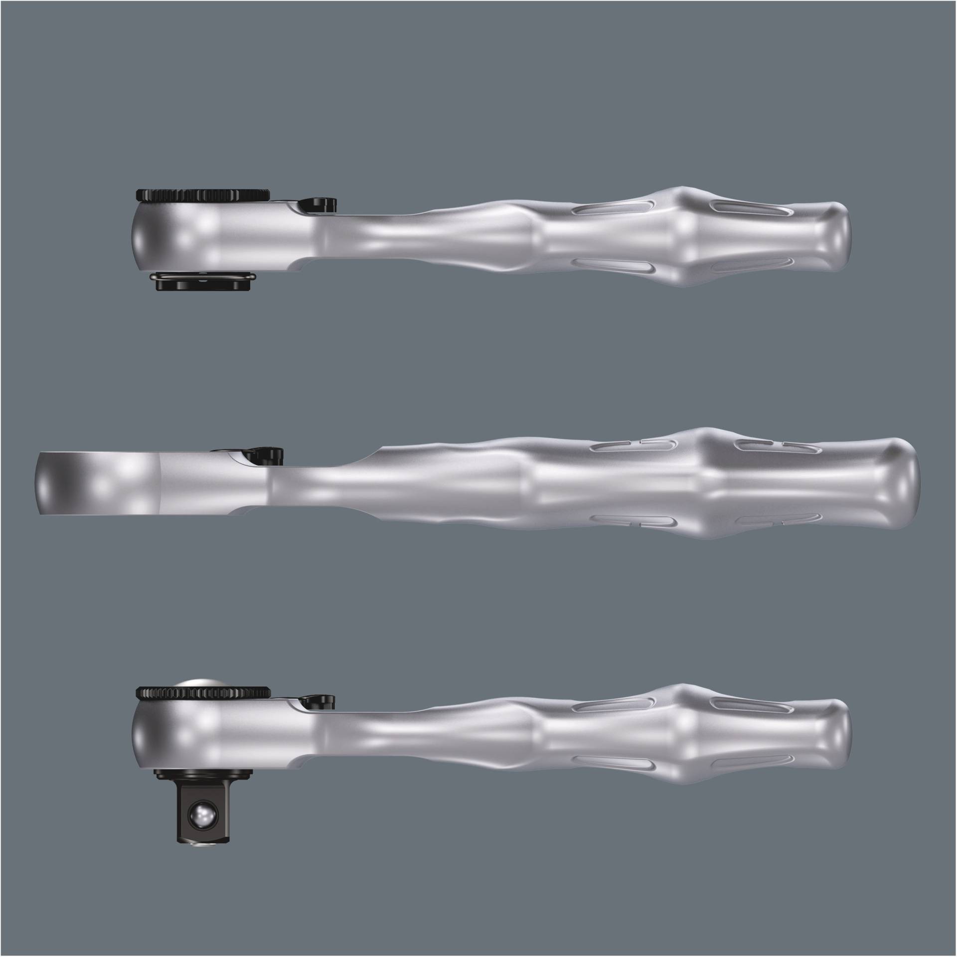 A lot of tools in a small space. Sorting according to output and size allows quick access to the bits. The Wera bit ratchet. Drop-forged full steel design. Fine tooth mechanism with 60 teeth allows a small return angle of 6° for precise work. Easy left/right switching. Ergonomically shaped ratchet head and lever.