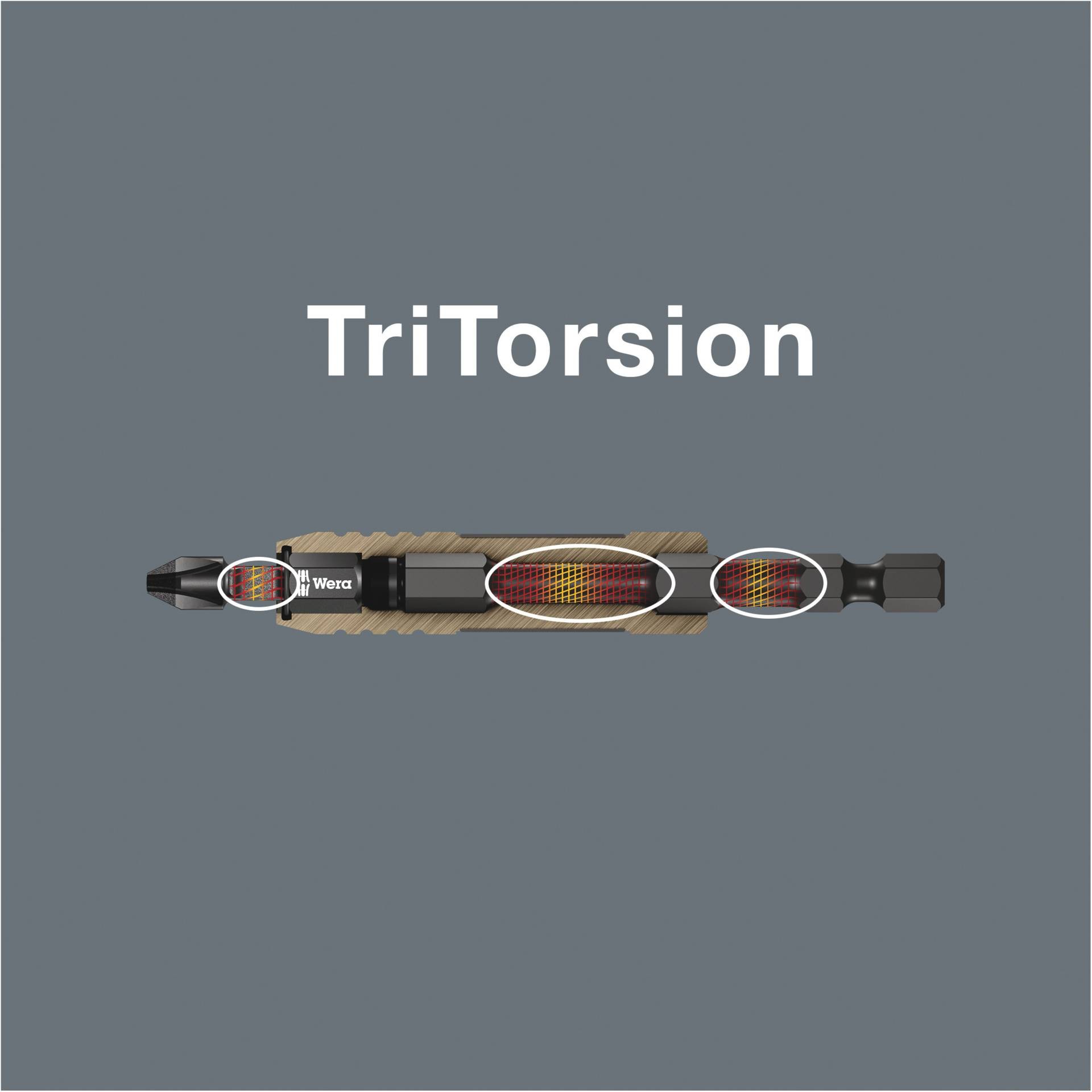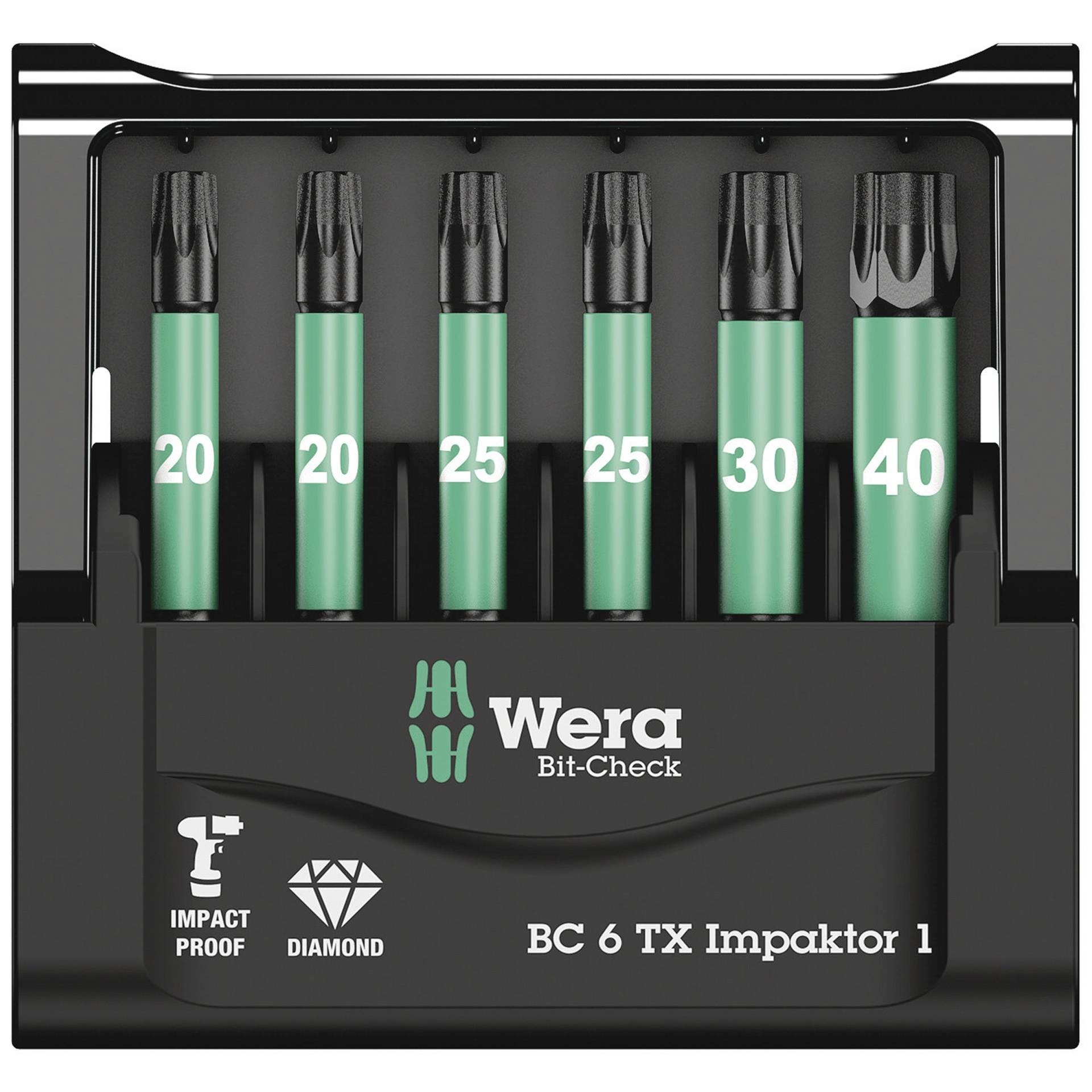 6 Wera impactor bits clearly arranged in a very small space in the practical Bit-Check. The impactor technology ensures above-average service life even under extreme conditions by making the best possible use of the material properties and by optimally adapted geometries. The bit tip is coated with tiny diamond particles and reduces slipping out of the screw through increased frictional resistance.