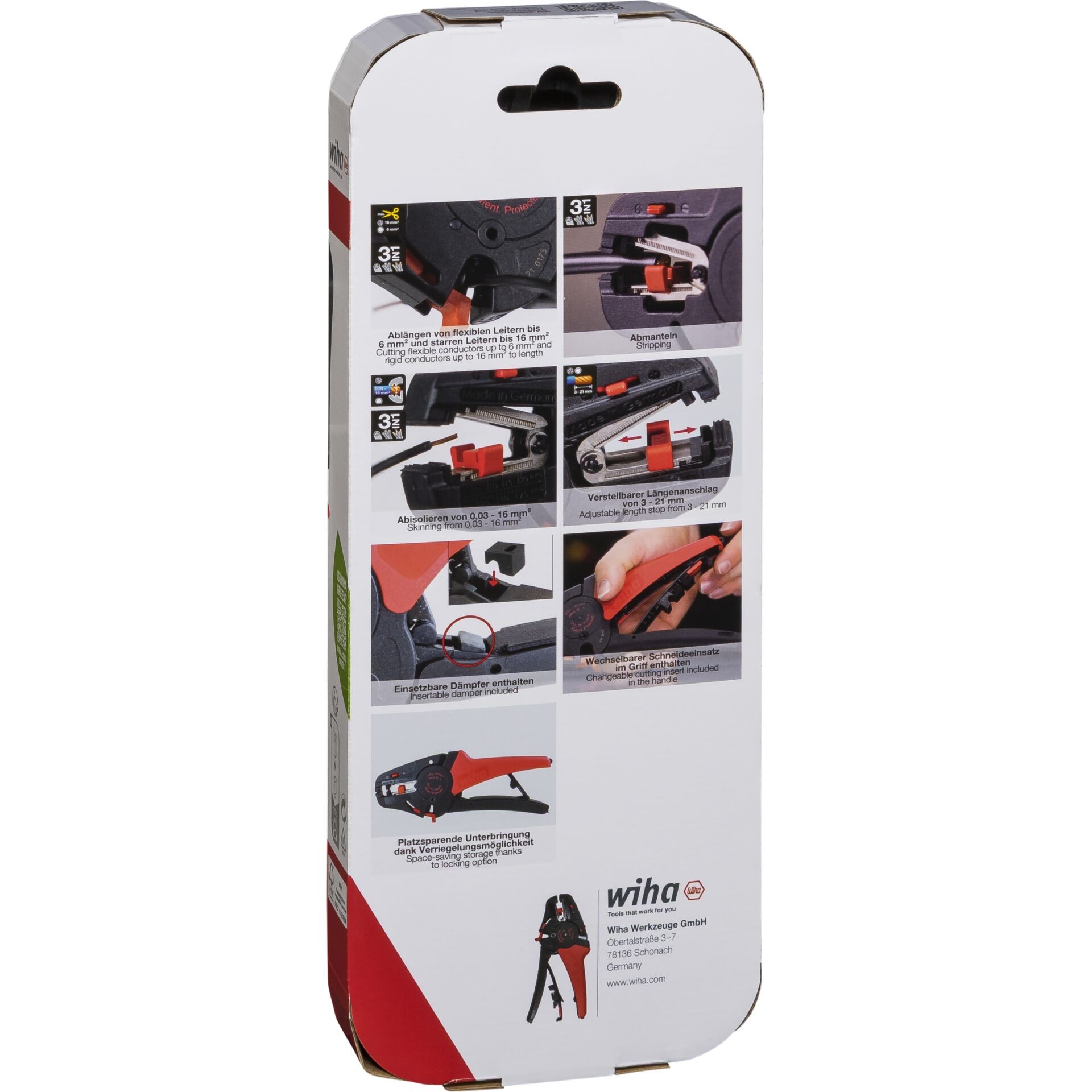 Automatski alat za skidanje izolacije tvrtke Wiha olakšava skidanje izolacije. Funkcija rezanja omogućuje rezanje kabela na odgovarajuću duljinu. Integrirani štitnik za ruke na oštrici štiti od ozljeda, a funkcija automatskog zatvaranja sprječava slučajno oštećenje drugih kabela u kabelskom snopu. Kliješta mogu skidati izolaciju s kabela od 0,03 do 16 mm². Podesivi graničnik duljine osigurava precizan rad. Alat za skidanje izolacije također radi vrlo tiho. Za velike presjeke kabela od 6 mm² i više, postoji prigušivač koji možete umetnuti u kliješta kako biste smanjili trzaj i ublažili naprezanje zglobova. Rezervne oštrice i zamjenska pomagala integrirani su u ručku za brzu upotrebu. Alat za skidanje izolacije štedi prostor i sigurno se zaključava kada zaključate ručke. Idealan je za mobilnu upotrebu.