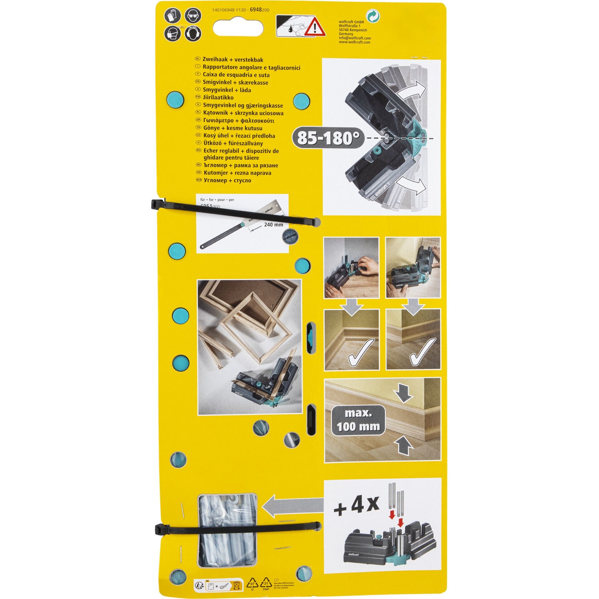 The bevel and cutting blade is a practical 2-in-1 tool for measuring angles and precise sawing of miters. With two movable arms, angles of 85-180° can be precisely picked up and automatically transferred to the saw. Thanks to integrated guide pins, it allows for flawless cuts, ideal for skirting boards up to 100 mm in height.