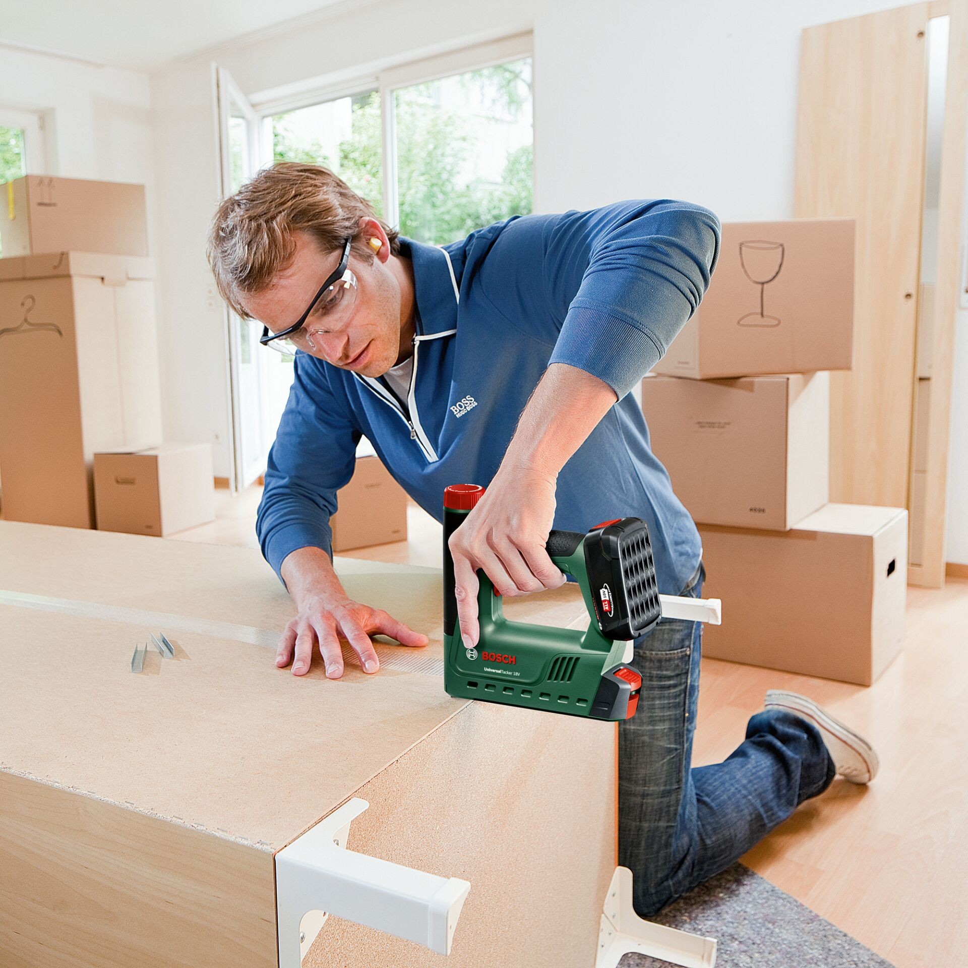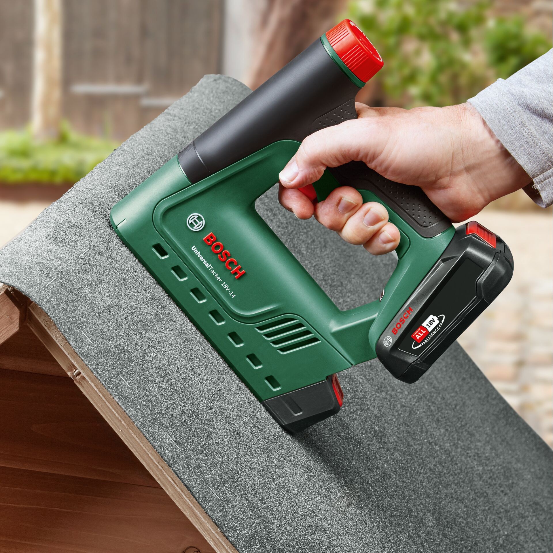 The UniversalTacker 18V-14 is a cordless nail and clamp tool that offers maximum comfort and versatility for DIY fastening work. This ergonomic stapler is designed for effortless stapling and nailing, and it will powerfully clamp and nail soft and hardwood. When working with different materials and clamp lengths, the impact force can be adjusted to the optimum strength using the rotary wheel. The push+release system ensures optimal control during handling by preventing self-release. For quick mounting, for example when lining raised beds, the rapid fire mode can be activated, which delivers up to 30 shots per minute. And with the practical clip level indicator you can see at a glance whether the stapler needs to be refilled. The integrated Bosch Syneon Technology ensures optimal performance and maximum runtime.The device is part of the 18V POWER FOR ALL system. A single battery can be used for all 18V POWER FOR ALL tools.