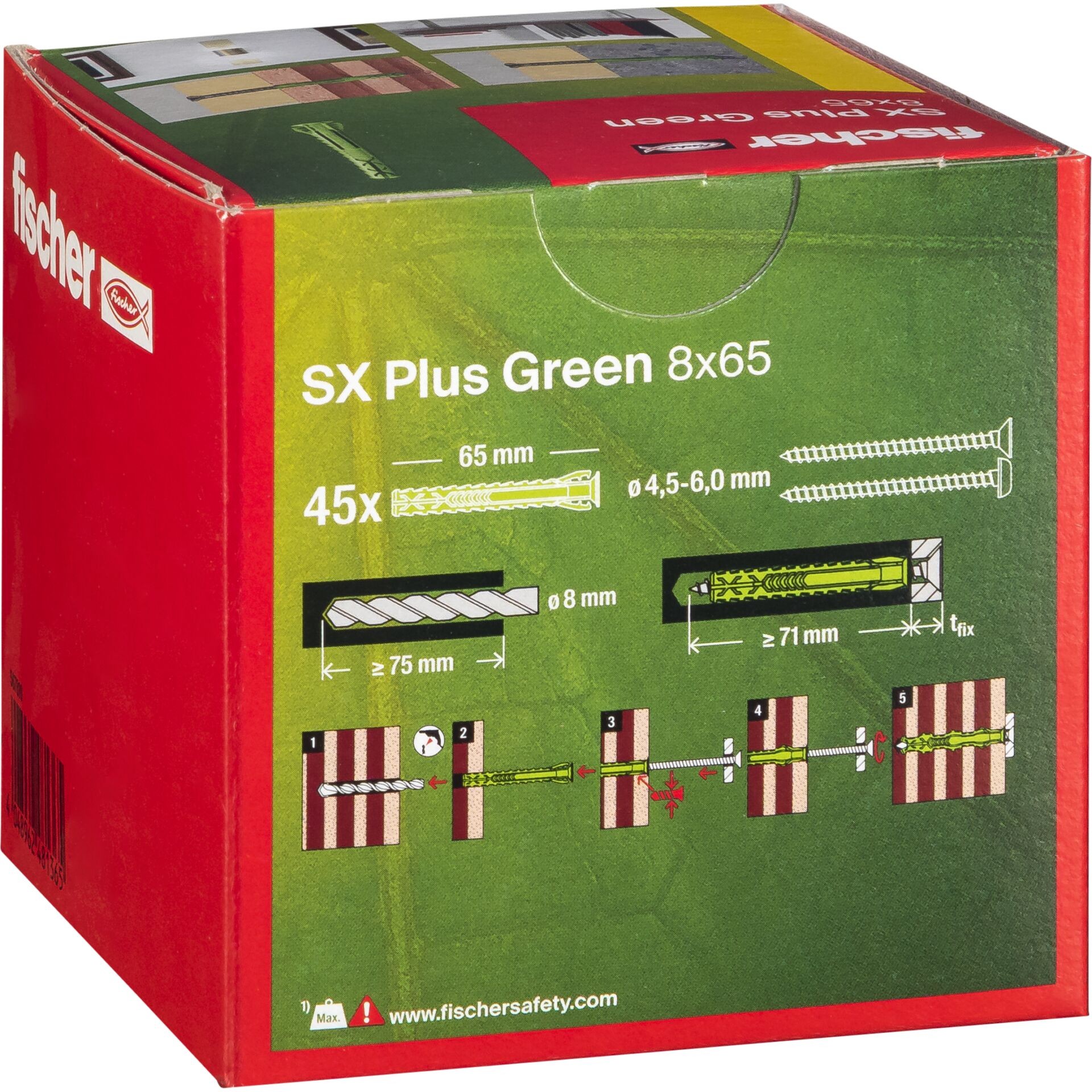 SX Plus Green izrađen je od 50 % obnovljivih sirovina i nudi visoke vrijednosti držanja u punim i perforiranim građevinskim materijalima zahvaljujući 4-strukom širenju. Pričvrsna krila omogućuju jednostavnu ugradnju vijaka samo jednom rukom, dok vrat bez širenja sprječava oštećenje površine. Tipla se lako umeću sa samo nekoliko udaraca čekićem, a primjetan moment pritezanja sprječava prekomjerno zatezanje vijka.