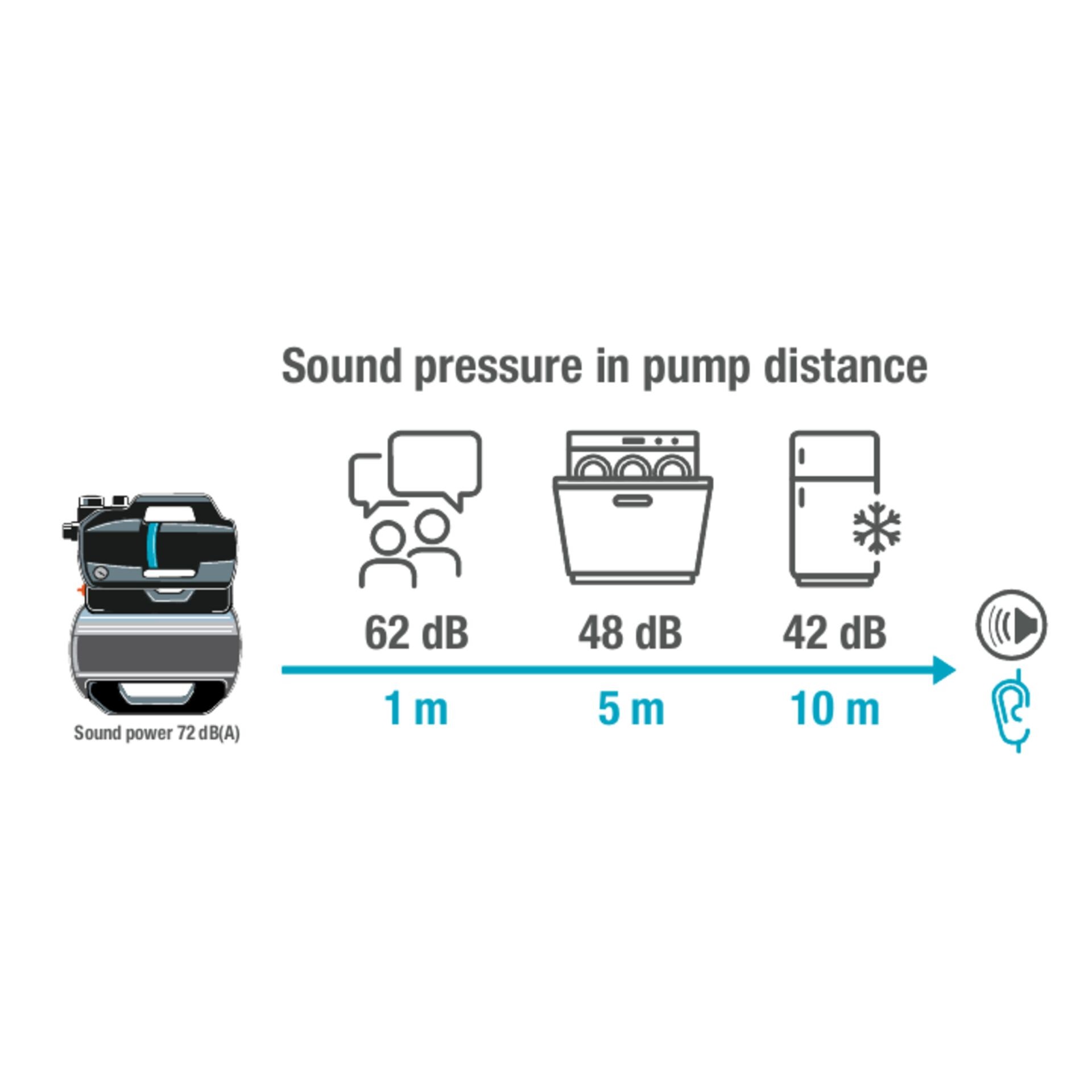 Die Druckpumpe ist leistungsstark bei einer Förderhöhe von 43 Metern (4,3 bar) und einer Durchflussrate von 3900 Litern pro Stunde. Der moderate Stromverbrauch von nur 650 Watt zeigt die hohe Effizienz des in Deutschland entwickelten Hauswasserwerks. Das geräuschhemmende Kunststoffgehäuse reduziert die Lautstärke auf 75 dB(A) Schalldruck in 5 m Entfernung, sodass die Pumpe vergleichsweise leise im Betrieb ist. Die Stellfüße aus Gummi sorgen für einen festen Stand der Pumpe sowie einen vibrationsarmen Betrieb. Der Standfuß kann zudem verdeckt am Boden festgeschraubt werden.