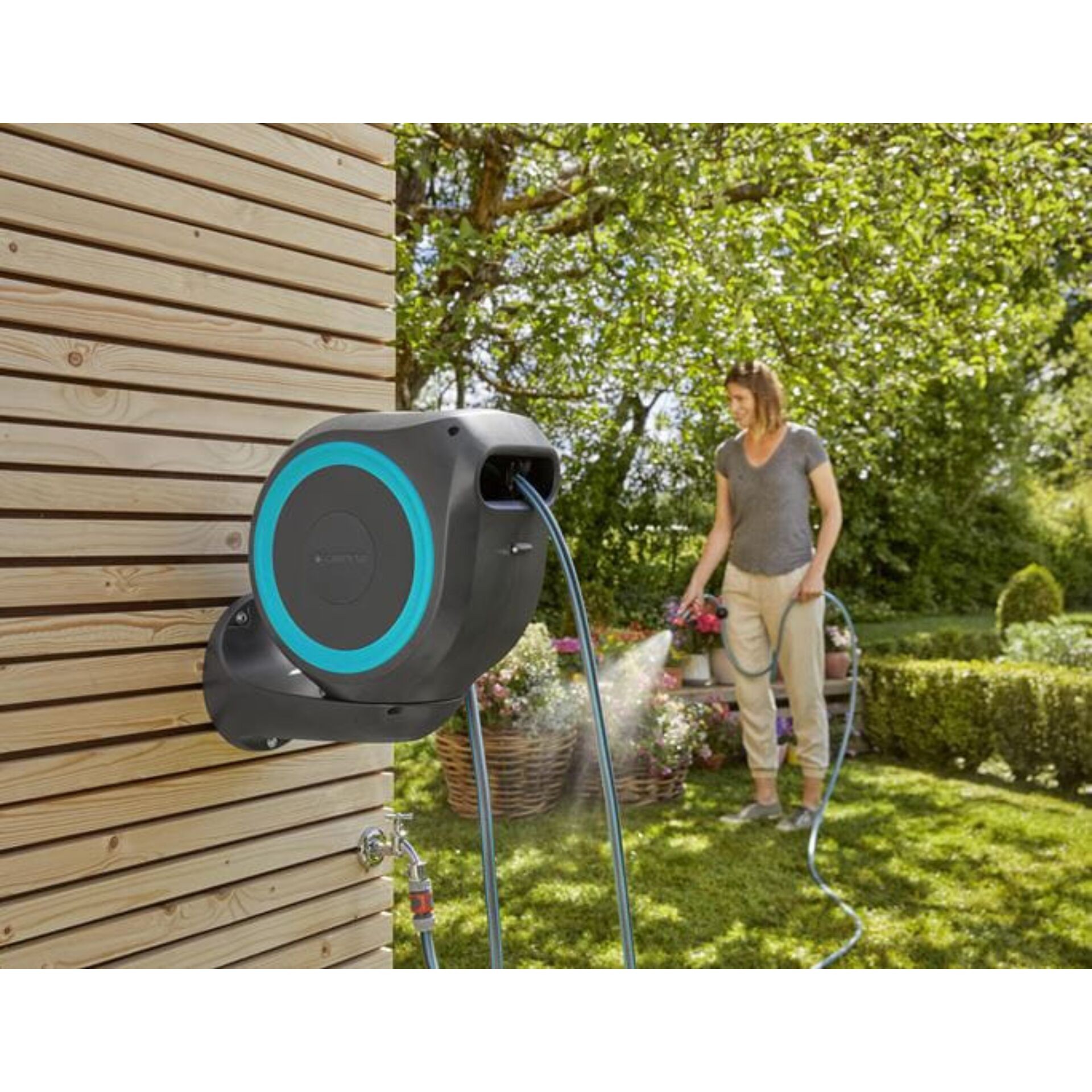 Zahvaljujući praktičnom zidnom nosaču, kutija za crijevo može se zakretati pod kutom većim od 180°. To vam omogućuje fleksibilno zalijevanje svakog kutka vašeg vrta bez savijanja crijeva.