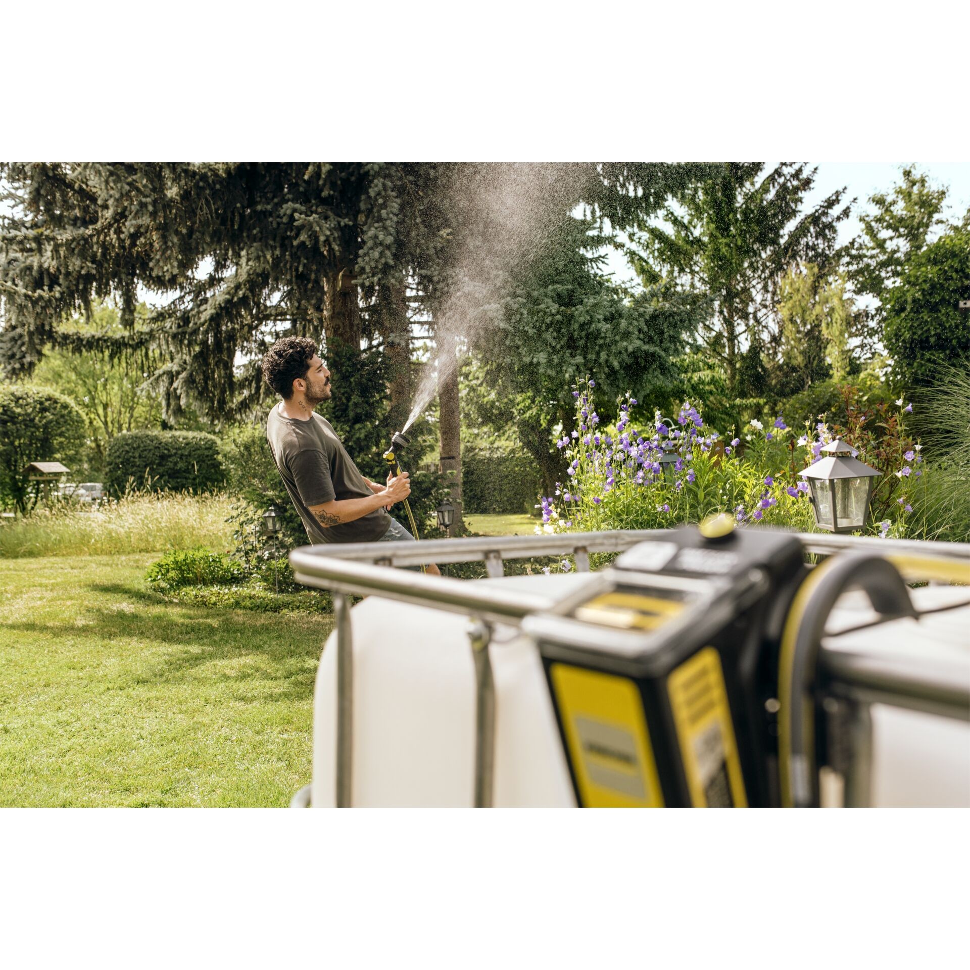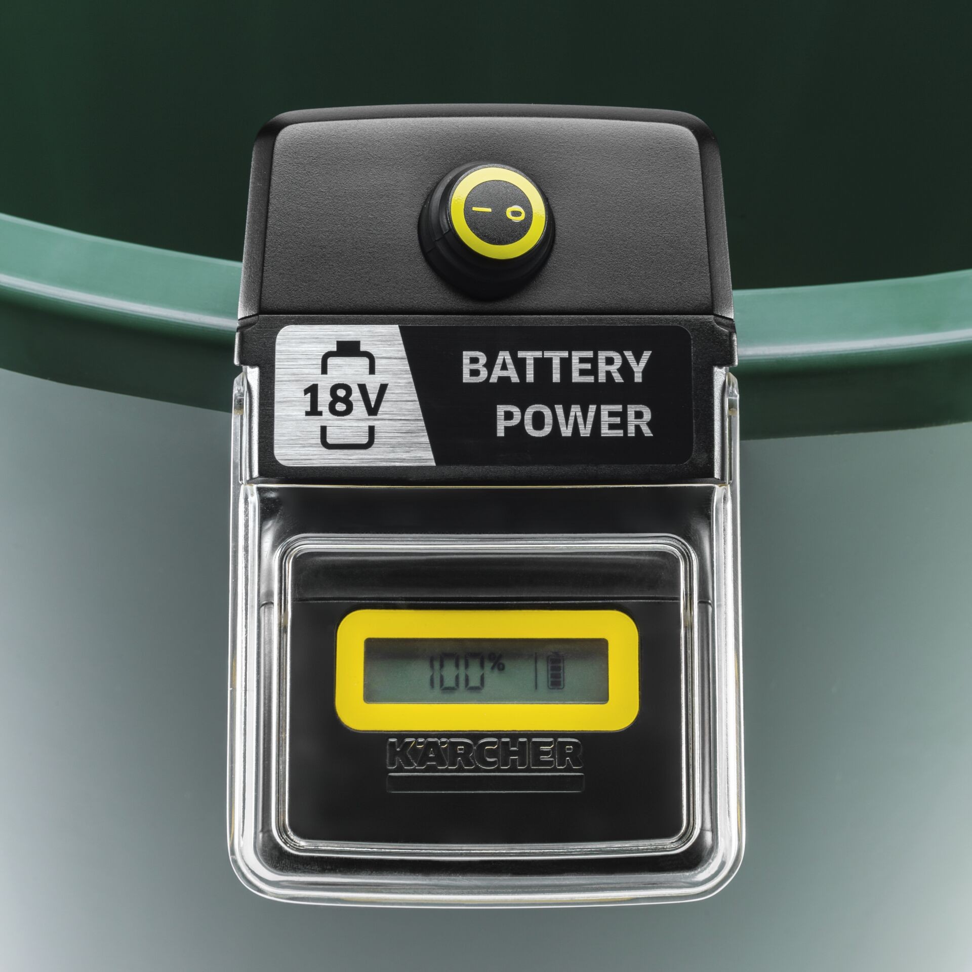 Stezaljka za montažu bačve osigurava ne samo savršeno pričvršćivanje za različite bačve, već i rad koji ne napreže leđa zahvaljujući prekidaču za uključivanje/isključivanje, kao i mogućnosti montaže na baterije. Zahvaljujući prozirnom poklopcu baterije, korisnik ima savršen pogled na prikaz baterije u stvarnom vremenu. Kako bi se osiguralo da se crijevo ne presavija tijekom zalijevanja iz bačve, postoji vodilica crijeva koja jamči konstantan protok vode. Ovisno o potrebama i području. Primjena, ova vodilica crijeva može se postaviti u 3 položaja: ili kliknuti na mjesto s lijeve ili desne strane nosača bačve baterije ili labavo na slobodnom prostoru na rubu bačve,