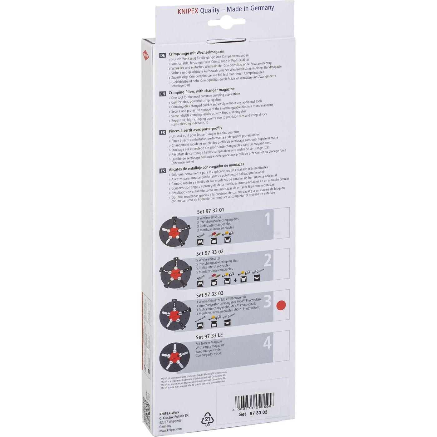 KNIPEX MultiCrimp alat za krimpovanje neophodan je alat za svakoga tko radi s fotonaponskim sustavima. S samo jednim alatom i tri umetka za krimpovanje možete sigurno i učinkovito krimpovati različite kabele i konektore. Zamjena umetaka za krimpovanje je brza i jednostavna, bez potrebe za dodatnim alatima.