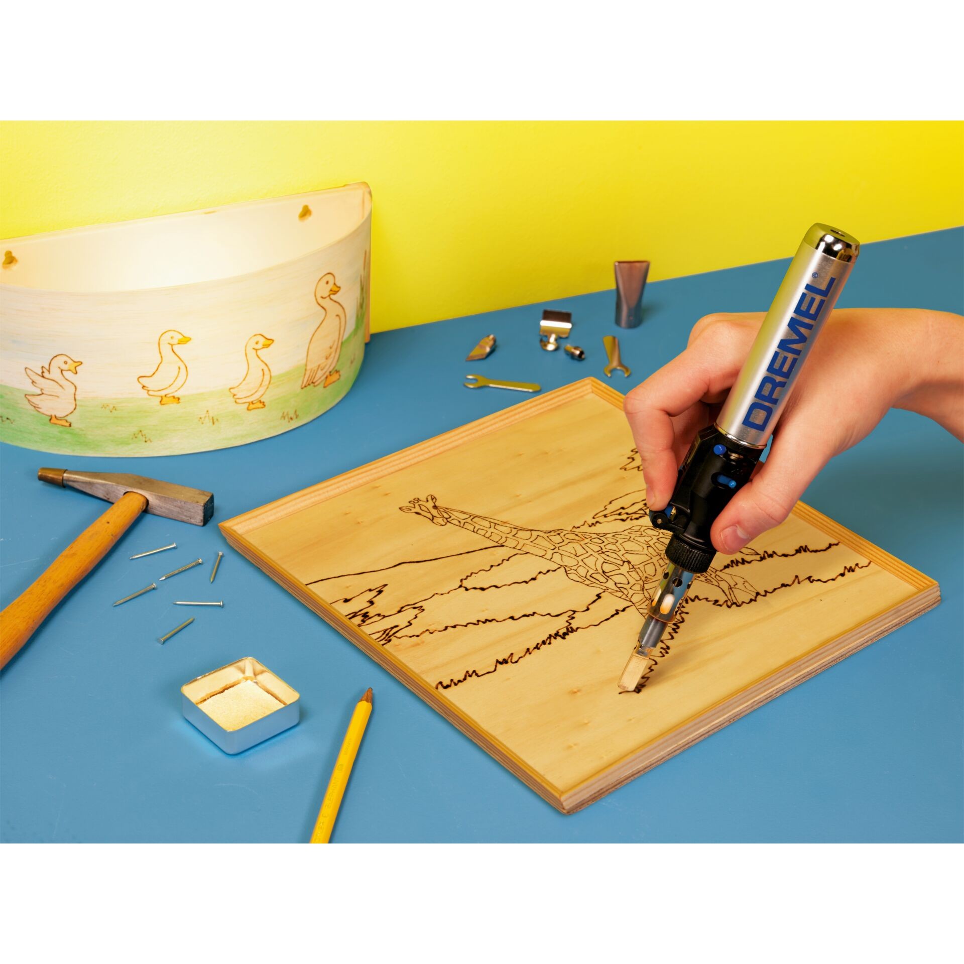 The Dremel VersaTip is a versatile, cordless, butane-powered soldering iron suitable for a wide range of applications from soldering to fire painting. It offers a variable temperature setting, a lock for continuous operation and a lock to avoid mishaps.