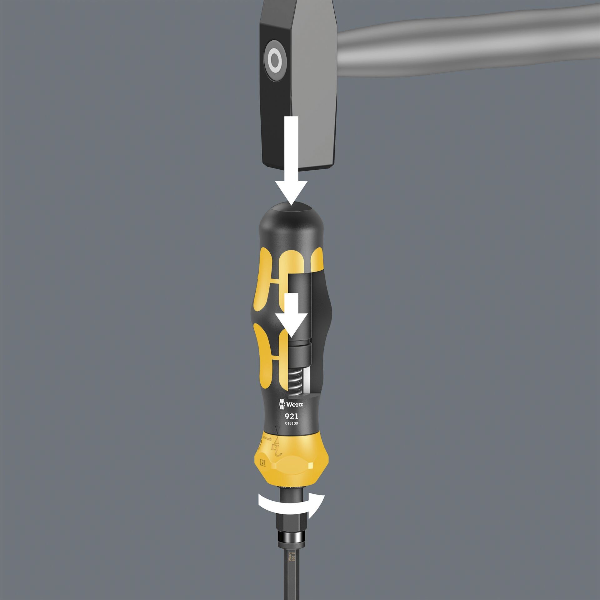 Udarni odvijač 921 kombinira prednosti ručnih udarnih odvijača, kompaktnih alata i odvijača s prolaznom oštricom. Funkcija udarnog odvijača ima moment odvrtanja do 25 Nm. Robusni držač bitova omogućuje korištenje različitih specijalnih bitova za različite profile vijaka. Kontinuirana oštrica osigurava prijenos snage bez gubitaka. Funkcija udarnog ključa i funkcija odvijača mogu se prebacivati ​​po potrebi.