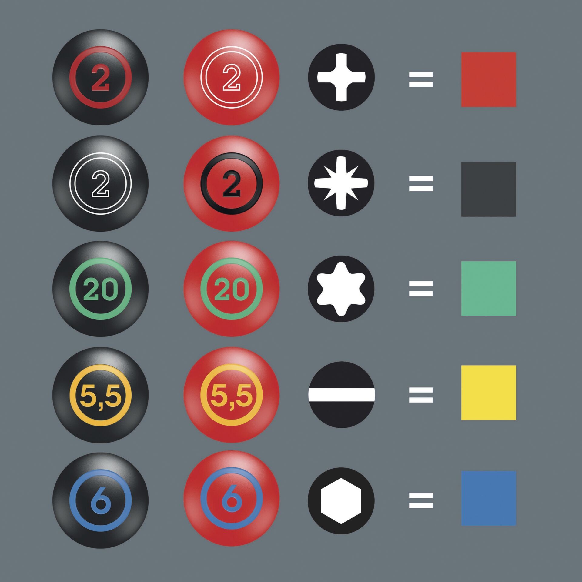 Kraftform Plus drška za ugodan ergonomski rad, izbjegavajući žuljeve i žuljeve, Tvrde zone hvata za veliku radnu brzinu, dok meke zone hvata jamče visoki prijenos okretnog momenta, PH odvijači s laserskim vrhom: Vrh Wera odvijača s laserskim vrhom mikroskopski je hrapav laserskim zrakama, Ova hrapava površina doslovno "zagrize" u glavu vijka, Slučajno iskliznuće je stvar prošlosti, Tražilica alata Take it easy s kodiranjem boja prema profilima i oznakama veličine - za brzo i jednostavno pronalaženje potrebnog alata, Križne drške s funkcijom držanja za sigurno držanje šesterokutnog vijka na alatu,