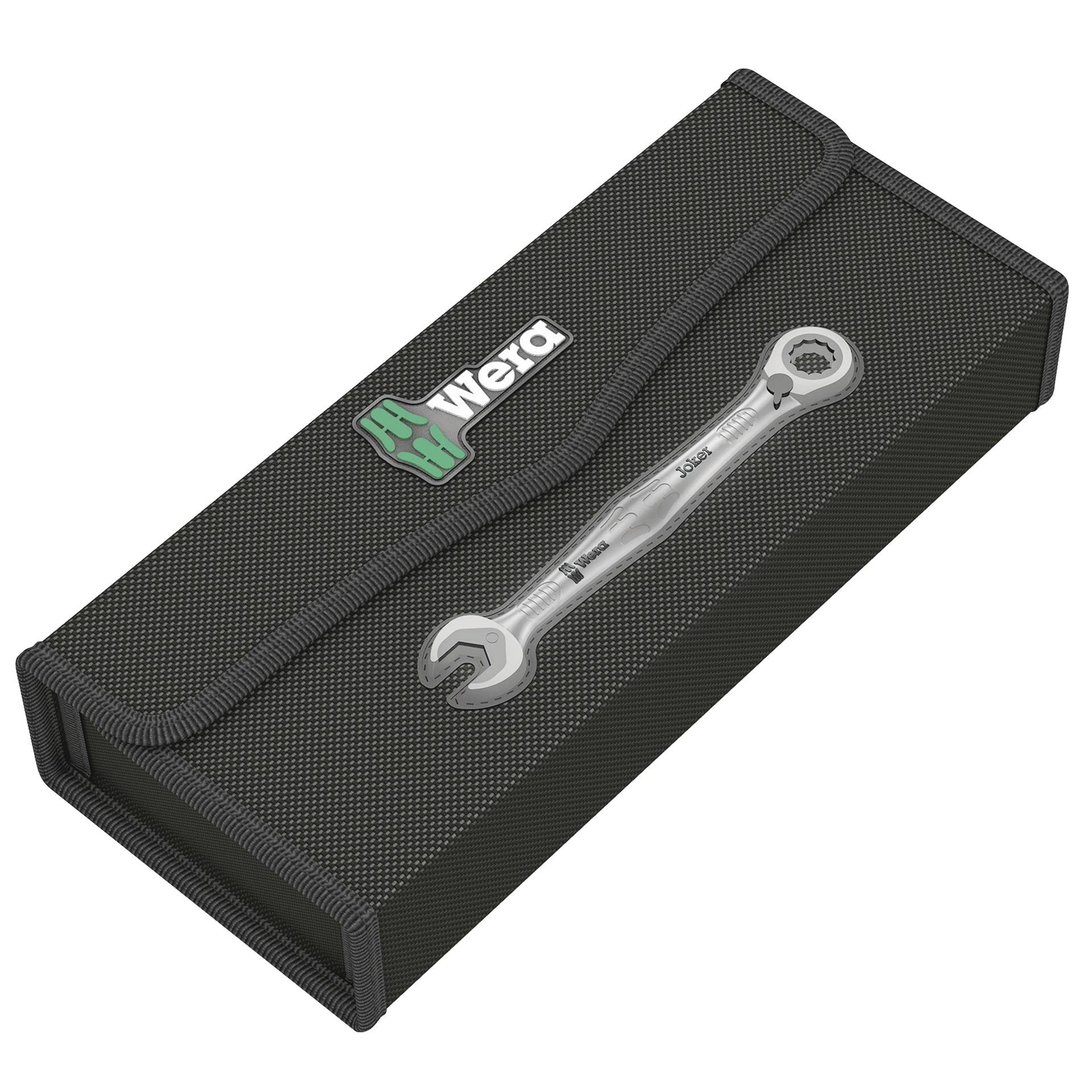 Visokokvalitetni set kombiniranih ključeva s račvastim zupcima tvrtke Wera: Joker kombinirani ključevi s račvastim zupcima s kutnom glavom račve i polugom prekidača, Metalna ploča u čeljusti osigurava funkciju držanja koja smanjuje rizik od gubitka matica i vijaka, Integrirani graničnik može spriječiti klizanje s glave vijka prema dolje i omogućuje primjenu većeg momenta, Zamjenjiva metalna ploča u čeljusti sigurno drži matice i vijke svojim ekstra tvrdim zubima i smanjuje rizik od klizanja,