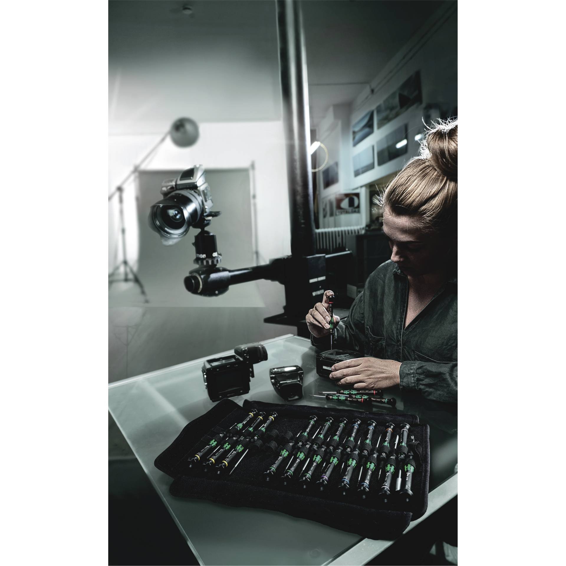 Wera Micro odvijač u setu za precizne mehaničke vijčane spojeve, Oslanjanjem ruke na rotirajuću kapicu i zonom brze rotacije ispod rotirajuće kapice, moguće je munjevito brzo okretanje, Više nije potrebno dugotrajno ponovno stezanje, Skladištenje i transport u robusnoj torbi, tako da je alat uvijek pri ruci,